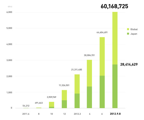 NHN Japan株式会社は、無料通話・無料メールスマートフォンアプリ「LINE」の登録ユーザー数(iPhone/Android/Windows Phone/フィーチャーフォンの総計)が9月8日に世界6000万人・日本国内2800万人を突破したと発表した。