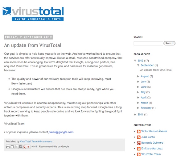 VirusTotalはスペインの企業で、セキュリティサービスを提供。公式ブログによると、「私たちのゴールはいたってシンプル。ウェブの安全を守ることであり、それに対して改善する努力を続けてきました。しかし私たちは小さな企業で、時にそれはチャレンジなことでもありました。Googleのパートナーとれることは喜ばしいことです」とコメントしている。