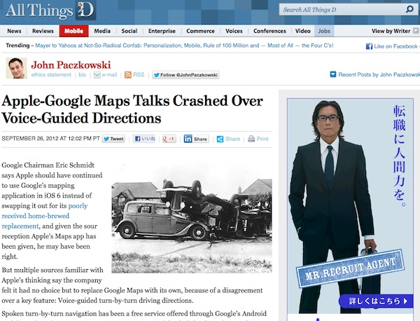 IT系ニュースサイト「AllThingsD」の記事によると、アップルがiOS 6においてGoogle Maps を採用しなかった背景には、音声ガイド機能に関する交渉決裂があるという。