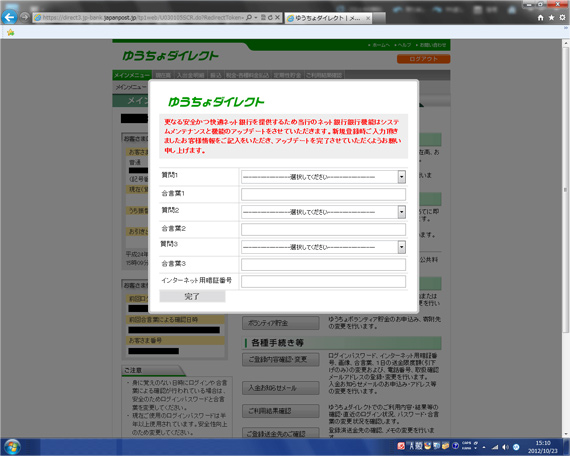 発表によると、ユーザーが金融機関の正規のインターネットバンキングのページからログインをした場合に、不正にポップアップ画面が表示されて、「システムのメンテナンスや機能の向上のためにお客様情報の再入力をお願いします。」といった記載とともに「第2暗証」および「質問・合言葉」「インターネット用暗証番号」などの入力フォームが表示される手口が発生しているという。