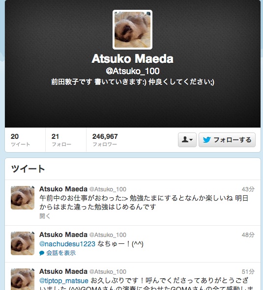 一言目のつぶやきは「前田敦子です 今日からつぶやいていきます:) 一言目だ--!! 楽しいから今日はいっぱいいっぱい 書こう」で、現AKB48メンバーの篠田麻理子(@mariko_dayo)との「@Atsuko_100 あっちゃーんつぶやいてー(笑)」「@mariko_dayo ???ここでいいの??」などのやりとりも。フォロワー数25万人越えは目前で、まだしばらくは破竹の勢いで伸びていきそうだ。