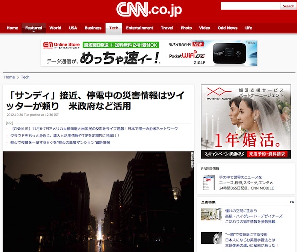 CNNが、米東部に上陸した温帯低気圧「サンディ」による被害が広がる中、政府や自治体などがTwitterを利用して災害情報を提供し続けているという記事を掲載している。