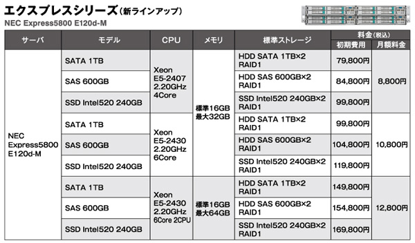 対象となるのは「エクスプレスシリーズ」および「エクスプレスG2シリーズ」。エクスプレスシリーズでは新たに日本電気株式会社(NEC)のExpress5800 E120d-Mを採用。4コアCPUと16GBメモリ、耐障害性の高いミラーリング構成のHDD 1TBという構成で月額8800円で提供する。最大12コアCPU・メモリ64GBまでの構成が可能なほか、内蔵ストレージとしてSSDも選択可能。