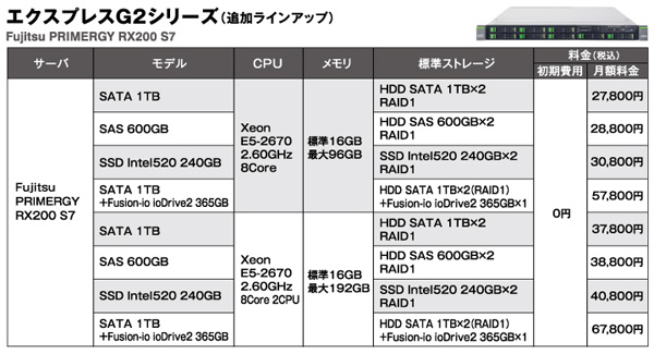 エクスプレスG2シリーズは、これまでの富士通株式会社のPRIMERGY RX100 S7に加え、新たにPRIMERGY RX200 S7を追加。最大16コアCPU・メモリ192GBまで対応するほか、内蔵ストレージも最大9台まで搭載可能。また、SSDやFusion-io社のioDriveおよびioDrive2を標準構成として選択することもできる。
