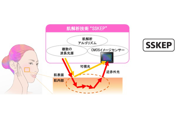同技術は裏面照射型CMOSイメージセンサーなどと複数の波長光源制御、肌解析アルゴリズムなどで構成される独自の肌解析技術。肌解析では一般的に、皮膚表面に加えて近赤外光でしか届かない皮下の情報の取得が重要となるが、SSKEPでは複数の波長光源の出力とCMOSイメージセンサーでの撮像の双方を最適に制御することにより、可視光から近赤外光の領域まで好感度な撮影を実現し、多様で高精度な測定を可能にした。