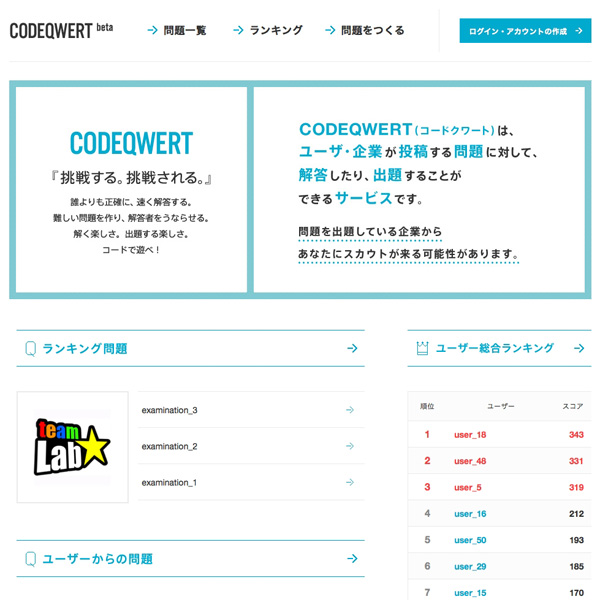 「CODEQWERT」は、学生向けのプログラミングコンテスト「CODE VS 2.0」の兄弟サイトに該当するサービス。アルゴリズムの問題に対し、求められるプログラムを記述/アップロードすることで、事前に用意されたテストケースに対して結果が一致するかの正誤判定が自動で行われる。解答のスピードと正確さを基準に、参加者の「スコア」がランキング表示されるなどの要素もあり。難しい問題に挑戦する楽しさ/挑戦される楽しさの双方を感じることができるサービスとなっている。