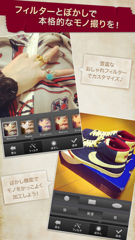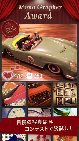 同サービスは「モノ撮り」に特化した写真共有サービス。インテリアや雑貨、ファッションアイテムなどお気に入りの“モノ”をフィルターやぼかし機能を使って撮影し、共有できる。また、投稿される写真の中から、ほかの利用者からもらえる“ステキ!”数によってベストフォトを選出する「ベストアワード」とランキングを毎日発表するので、コンテストに参加する感覚で投稿を楽しめる。
