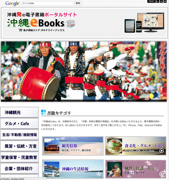 だが、電子出版という新しいビジネスモデルへの関心が高まるなか、沖縄地域で発行されている書籍や雑誌などを集めて電子書籍化して発信するポータルサイト「沖縄eBooks」(http://www.okinawa-ebook.com/)が2011年5月に正式オープン(同年1月にプレオープン)。沖縄の出版文化を県外に発信する取り組みとして、県内のメディアだけでなく、IT関連の情報を紹介するニュースサイトなどでも取り上げられ、注目を集めた。