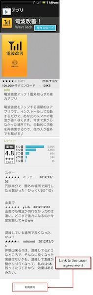投稿によると、最近までAndroid.Enesolutyをホストしているページにはアプリの偽の説明文、偽のダウンロード件数、偽のレビュー投稿、偽のダウンロードリンクしかなく、利用規約の類は無かった。しかし現在はこれまでの情報に加え、どのページにも利用規約へのリンクが追加表示されているという。