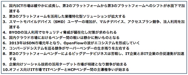 IDC Japan株式会社は、2013年の国内IT市場においてキーとなる技術や市場トレンド、ベンダーの動きといった主要10項目を発表した。