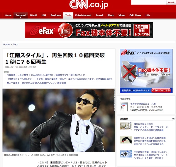「江南スタイル」の再生回数が史上初・10億回突破