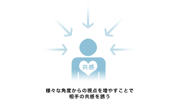 ではどのようにして、相手の目線に合わせていくか。狙うべきは「相手の共感」を得ることだ。相手の共感を意識すると「相手の立場・状況」といった、別角度の切り口が見えてくる。これにより、押さえるべき視点が増えて、相手の目線にあわせたプレゼンができるようになる。
