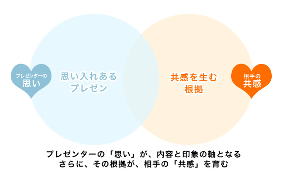 プレゼンにおいて、内容以上に印象が左右するとは「内容<印象」という図式ではなく、内容への共感をはぐくむために、印象をうまくコントロールして取り組む必要があるということだ。その印象を司るポイントであるプレゼンター自身の「思い」は、結局のところ内容が良くなければ発動しない。プレゼン内容への強い「思い」が、「共感」を育む要となる「根拠」を生む。さらにその思いがプレゼンの「印象」を司る。この連鎖的事由を忘れてはならない。