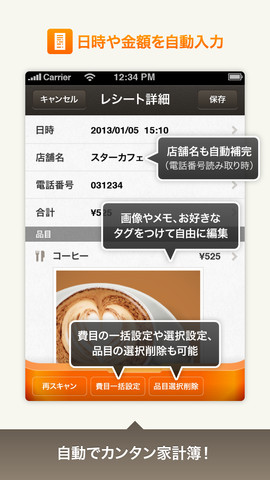 同アプリはレシートのデータ化や分析、記録、共有などの機能を提供する家計簿/支出管理アプリ。iPhoneで写真を撮るだけでレシートの情報がその場で自動的にデータ化されて、グラフなどで簡単に分析できる。読み取ったデータに写真やメモを加えて情報を充実させたり、Evernoteと連携してライフログとして記録を蓄積したりすることも可能だ。さらにFacebookへの投稿機能も搭載する。