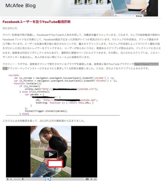 マカフィー株式会社は、同社の「McAfee Blog」においてFacebookユーザーを狙った偽のYouTubeプラグインに注意を喚起している。