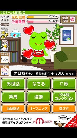 同アプリは同社のキャラクター「ケロちゃん」を花粉症にさせないように毎日世話する育成ゲームで、育成を通じて花粉症対策について学べる。また、登録された地域の花粉飛散情報と天気情報(天気、降水確率、最低/最高気温)も知らせる。