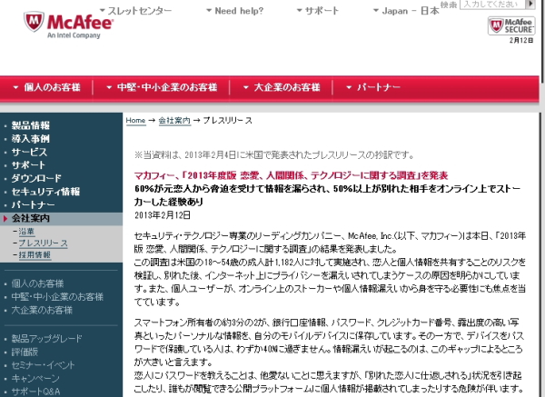 同調査は、恋人と個人情報を共有するリスクを検証し、別れた後にインターネット上にプライバシー情報などをアップされてしまうケースなどの原因を調べている。また、個人ユーザーが、オンライン上のストーカーや個人情報漏えいから身を守る必要性にも注目している。