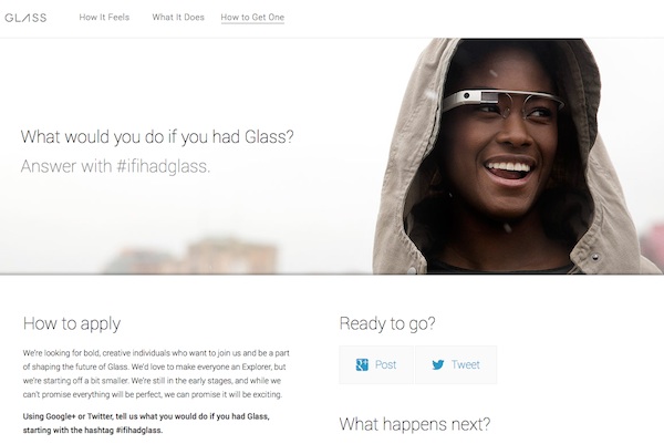 プロジェクトメンバーは「Glass Explore」として、プロトタイプを1500ドルで購入し試すことが可能だ。メンバーに応募したい場合は、Google+またはTwitterで「自分ならどのようにGoogle Glassを使うか」をハッシュタグ #ifihadglass をつけて投稿する。応募資格は米国在住者のみで、ニューヨーク、サンフランシスコ、ロサンゼルスで開催されるイベントに参加しGoogle Glassを受取ることになるという。