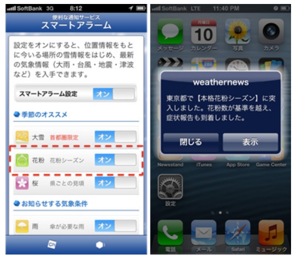 花粉情報は、GPS機能によって、利用者の現在地に合わせた情報が届けられる。また、大量飛散の場合はいち早く知らせる機能も備えている。