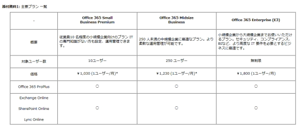 主要プランとしては、従業員10 名程度の小規模企業向けの「Office 365 Small Business Premium」が10ユーザーまでで1030円 (1ユーザー/月)、250人未満の中規模企業向けの「Office 365 Midsize Business」が250ユーザーまでで1230円 (1ユーザー/月)、小規模~大規模企業まで使える「Office 365 Enterprise」が対象ユーザー無制限で1800円 (1ユーザー/月)となっている。
