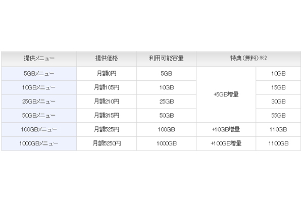 また、「フレッツ光メンバーズクラブ」、「リモートサポートサービス」、「オフィスまるごとサポート(ITサポート)」のいずれかの契約者には、特典として、利用のメニューに応じて5GB、10GB、100GBいずれかの容量が無料で追加増量される。