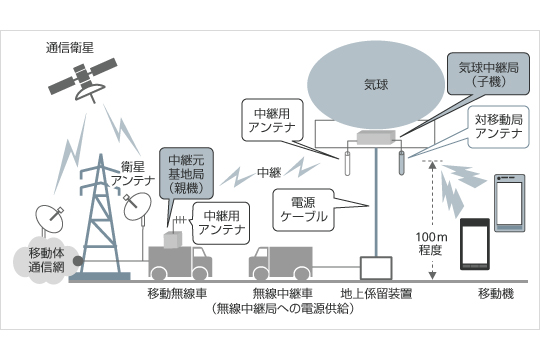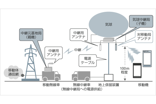 同実験では、中継元基地局(親機)と気球中継局(子機)で構成されており、子機を介して移動体通信網と移動局が接続され、3G端末(2.1GHz帯)での音声通話・データ通信が利用可能となる。子機の位置と高度を安定させるために係留気球を利用し、また気球を扁平型にすることにより気球の空中姿勢を安定させている。