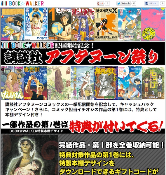 アフタヌーンのコミック配信を記念し、2013年3月14日(木)までの間、アフタヌーンコミックスを対象としたキャンペーン「BOOK☆WALKER配信開始記念 講談社アフタヌーン祭り」を開催。アフタヌーンレーベルのコミック5冊購入毎にBOOK☆WALKER専用WebMoney500円分をキャッシュバックするという。また、『げんしけん』『寄生獣』『無限の住人』『蟲師』などオススメタイトルの第1巻を購入すると、各作品のオリジナル本棚をプレゼント。