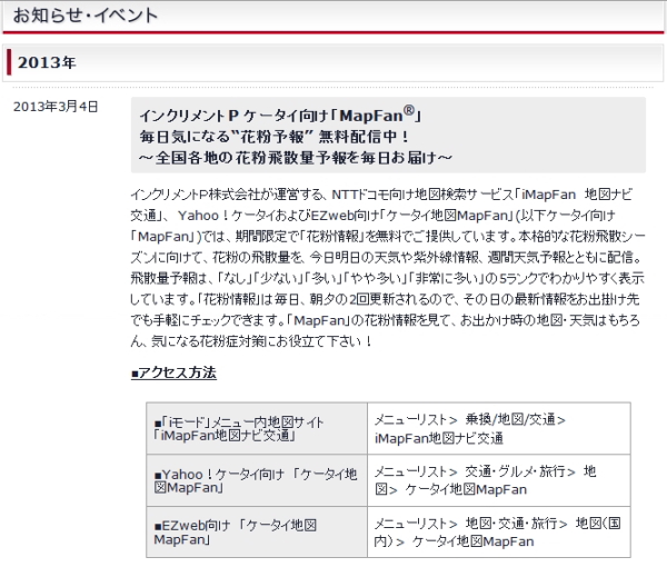 インクリメントP、携帯向けの「MapFan」で「花粉情報」を限定無料配信