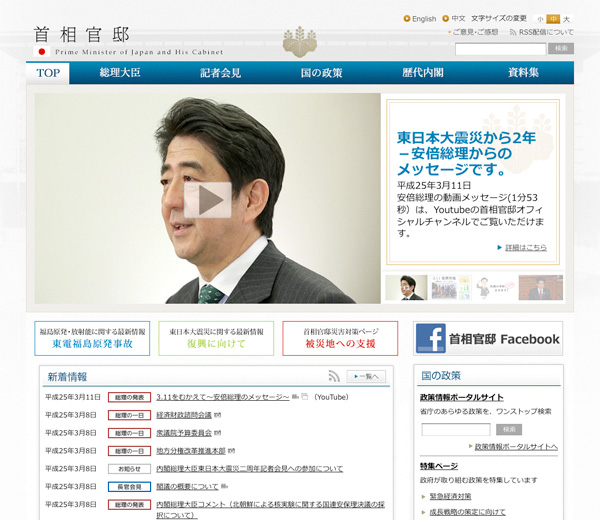 この動画メッセージは、被災地の人々、そして全国の皆に向けたもの。被災者への哀悼の意を表すとともに、あらためて“政府一丸となって現場現場の声を聞きすぐさま行動へ移していく”、“一日一日の重さを忘れることなく必ずや復興を加速”などの表明が行われた。さらに全国の皆に向けても、ボランティア活動/寄付/東北への旅行/東北の産品の購入など、さまざまな形での引き続きの支援を呼びかけている。