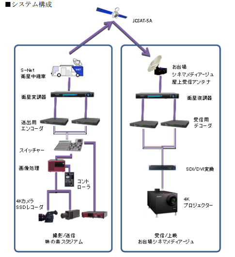 同実験は「FC 東京 vs 柏レイソル」戦を味の素スタジアム(東京都調布市)から衛星経由で、東京都港区のお台場シネマメディアージュに伝送し、パブリックビューイングとして上映したもので、4K映像伝送実験は2012年 10月20日に続いて2回目となる。今回はカメラを5台から7台に増やして、4Kのスーパースロー映像を使用した。