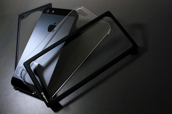 本製品は、上下のアルミフレームとポリカーボネート製の背面パネルで構成されるハイブリッド素材のバンパーケースだ。背面パネルはクリアタイプのため、iPhone 5の背面デザインをそのまま隠さずに使用できる。製品には、ネジ(4本+予備1本)/取り付け専用工具/液晶保護フィルム/クリーナークロスが付属。