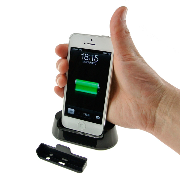本製品は、iPhone 5を縦向きに立てかけられる充電スタンドで、付属のアダプタを装着することでiPod touch(第5世代)にも対応。スタンドとiPhone 5/iPod touch(第5世代)との接続面にはLightningコネクタのほかにイヤホンプラグも搭載されており、スタンド背面にイヤホンジャックも実装。イヤホンやスピーカーなどを接続することで、充電中でも同時に音声の外部出力を行うことができる。