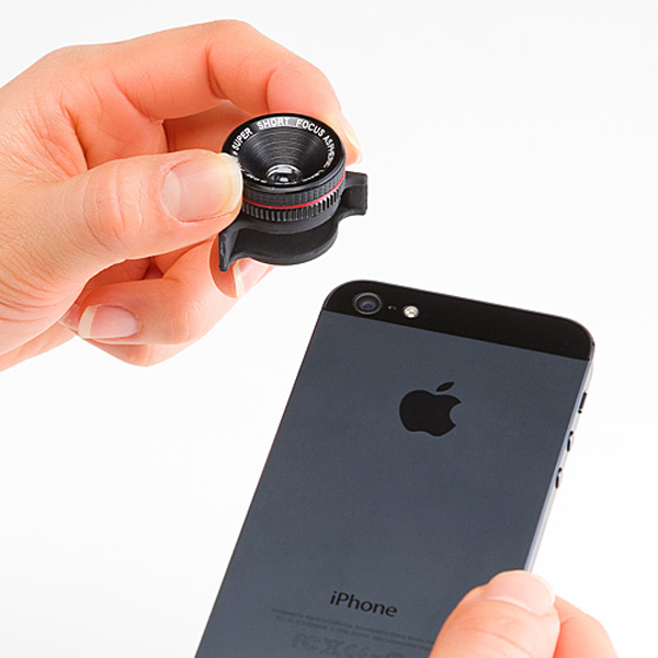 本製品は、装着時にiPhone 5用ケースを介するタイプではなく、ホルダーに装着したレンズをカメラ部に挟み込むだけで使用することが可能。レンズホルダーは2個用意されているため、気軽に素早くレンズの付け替えを行うことができる。同梱されているレンズの種類は、直径26mm/12gの魚眼レンズ、直径26mm/10gのマクロレンズ、直径35mm/18gのCPLフィルターレンズ。マクロレンズは5〜15mmまでの接写に対応しており、CPLフィルターレンズは反射水面やガラス板の乱反射を軽減できる円偏光レンズとなっている。