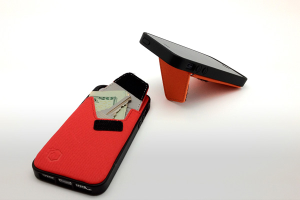 本製品は、クレジットカードなどを2枚まで収納できるポケットを実装したiPhone 5ケース。ICカード収納は、別売の防磁シートと合わせて入れることで対応する。ポケットのフラップには面ファスナーが付いており、収納したカード類の飛び出しを防止することが可能。このフラップを開いて立てかけることで、縦/横いずれの方向にも対応するiPhoneスタンドとしての役割も果たす。