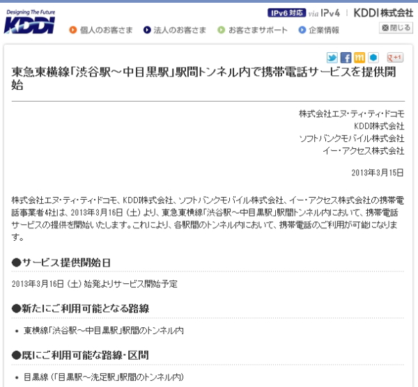 株式会社エヌ・ティ・ティ・ドコモ、KDDI株式会社、ソフトバンクモバイル株式会社、イー・アクセス株式会社の携帯電話事業者4社は、東急東横線・東京メトロ副都心線の相互直通運転化に伴って新設された渋谷~中目黒間の地下トンネルにおいて、携帯電話サービスの提供を開始すると発表した。