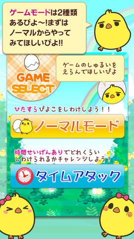 同アプリは、ひよこをフリックでオスとメスに分けるシンプルなゲーム。画面上から降ってくるひよこを、オスは右へ、リボンの付いたメスは左へフリックし、たまごやニワトリなどひよこ以外のものは下にフリックして仕分ける。ひたすら仕分けを続けるノーマルモードと、時間制限ありのタイムアタックの2種類のモードが用意されており、難易度や制限時間を選択できる。