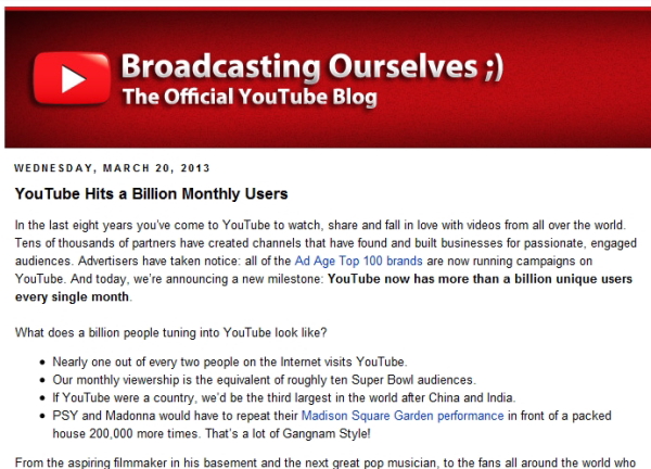 2006年にGoogleによって買収されたYouTube。月間10億人という数字は、「インターネット上の二人に一人がYou tubeを訪問」、「スーパーボウル視聴者の約10倍」に等しいと、同社が発表したブログで述べている。