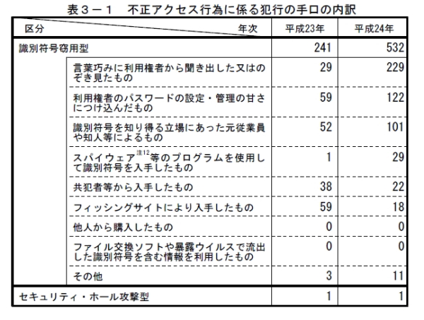 警察庁は28日、毎年公表されている不正アクセス行為の発生状況について、平成24年中のデータを発表した。また、不正アクセス行為の発生状況及びアクセス制御機能に関する技術の研究開発の状況も併せて発表された。