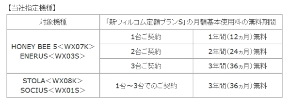 同発表によると、キャンペーンが適用されるのは、期間中に1台目を指定機種および指定プラン(料金コース「新ウィルコム定額プランS」)で新規にウィルコムと契約したユーザー。資格は22歳以下もしくは学生で、「新ウィルコム定額プランS」の月額基本使用料1450円が無料となる。無料期間は同時契約台数によって異なり、例えば、対象機種「HONEY BEE 5」(WX07K)で1台契約だと1年間無料、3台契約だと3年間無料となっている。