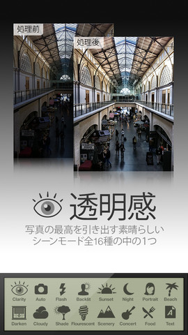 同アプリは、タッチ露出・フォーカス、デジタルズーム、透明感効果などの機能を備えたカメラアプリ。人物、ビーチ、日没など特定の状況下での撮影を支援する「シーンモード」や、ひと味違う写真に仕上げられる豊富なエフェクトを用意している。