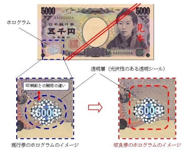 同発表では、早期の実施を目指して、3つの具体案を提示している。1つめは、5千円札の改良。これは、表面の左下にあるホログラムの透明層を拡大し、形状を変更するというもの。ホログラムの透明層の触感はその他の印刷面と異なるため、券種の識別性が向上する。改良5千円札の発行開始は、平成26年度前半を目標にするという。