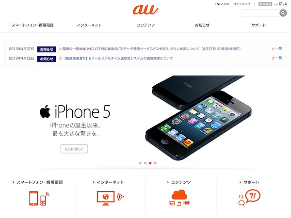 auは、4G LTE対応端末のLTEデータ通信サービスにおいて、2013年4月27日(土)16時01分から通信障害が発生していたと発表した。同日22時18分に復旧している。