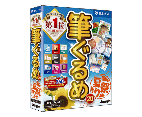 株式会社ジャングルは、富士ソフト株式会社開発のハガキ作成ソフト「筆ぐるめ 20」に、夏季の使用に適したコンテンツを中心とする350点の素材を追加した「筆ぐるめ 20 夏祭り」を5月16日に発売する。対応OSはWindows 8/7(SP1)/Vista(SP2)/XP(SP3)で、標準価格は4480円。