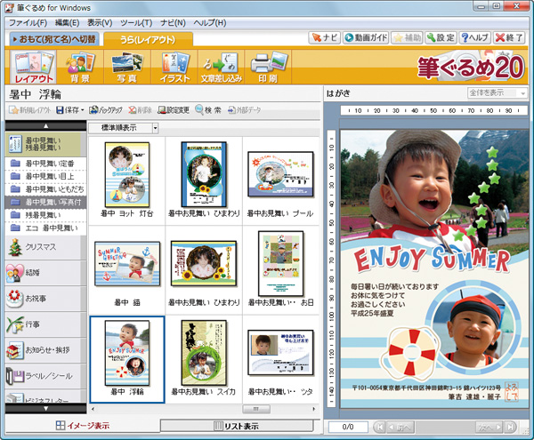 「筆ぐるめ」は、“たのしく・かんたん・きれい”をコンセプトにし、初心者にも扱いやすいUIが特徴的なハガキ作成ソフトだ。暑中見舞いや残暑見舞いなどの各種ハガキ作成と住所録管理のほか、ラベル印刷などへの活用も可能。「筆ぐるめ 20」収録素材として、レイアウト4750点、イラスト/写真/背景2万2250点、例文1970点、フォント142書体がDVD-ROMに含まれているほか、夏向けの追加コンテンツ350点もボーナスCD-ROMとして添付されている。