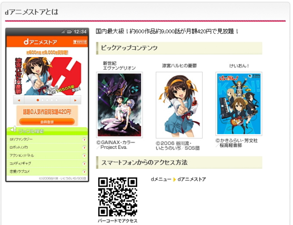 「dアニメストア」は、スマートフォン向けの配信サービス「dマーケット」で提供されている、アニメ動画見放題サービス。ラインナップは「新世紀 エヴァンゲリオン」や「けいおん!」など、約600作品(約9000話)で、月額420円の定額制となっている。