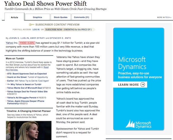 Wall Street Journalの記事によると、買収額は約11億ドル。Yahoo!はスマートフォンユーザーに向けたブログサービス市場に遅れをとっており、これを挽回する狙いでTumblrの買収に至ったという。また、買収については先週からYahoo!のマリッサ・メイヤーCEOとTumblrのデービッド・カープCEOが交渉中だとうわさが流れていた。