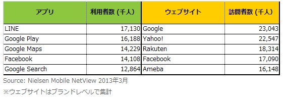 アプリだけに絞ると、1位LINE、2位Google Play、3位Google Maps、4位Facebook、5位Google Serchとなり、LINEの台頭とGoogle関連の強さが目立った。
