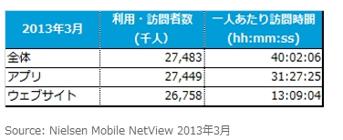 今回の発表に合わせて、「Mobile NetView」の2013年3月データが公開された。スマートフォンからの月間インターネット利用者(アプリの利用者とWebサイトの訪問者)は2748万人で、一人当たりの利用時間は40時間2分だった。アプリのみでは、利用者は2745万人、利用時間は31時間27分。Webサイトのみだと、訪問者が2676万人、訪問時間が13時間9分となり、アプリの利用時間はWebサイトの2倍超であることがわかった。