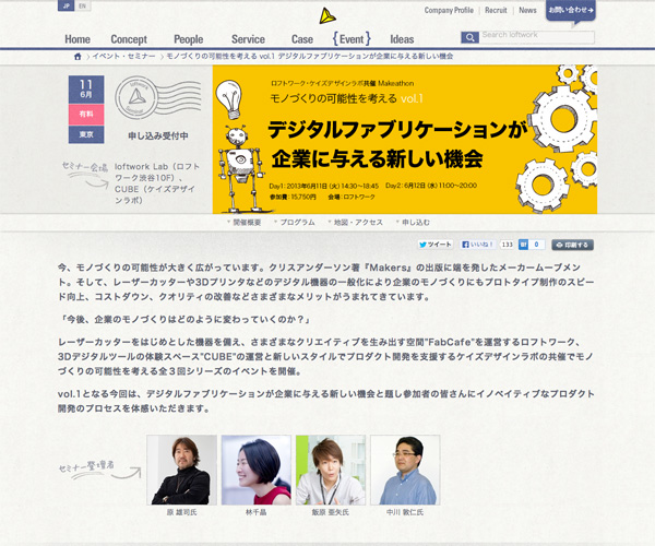 株式会社ロフトワークと株式会社ケイズデザインラボは、共催イベント「モノづくりの可能性を考える vol.1 デジタルファブリケーションが企業に与える新しい機会」を開催する。レーザーカッターや3Dプリンタなどのデジタル機器の普及により大きな注目を集める“モノづくり”。その可能性を考える全3回のシリーズイベントで、第1回目となる今回は6月11日14:30~18:45(14:00受付開始)と6月12日11:00~20:00(10:45受付開始)の2日間にわたって開催される。
