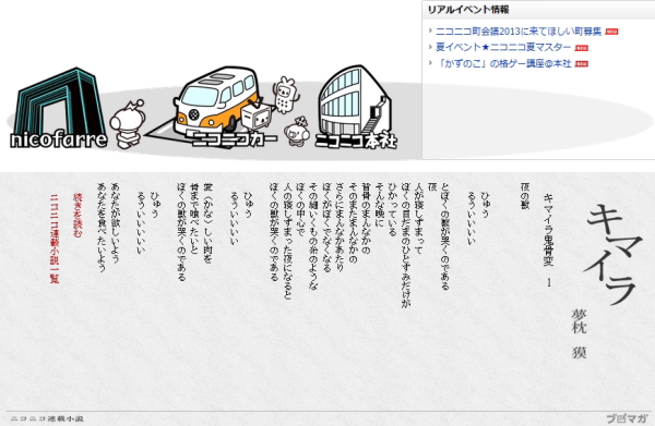 ニコニコ動画で無料小説配信! 夢枕獏「キマイラ」や伏見つかさ「俺妹」などが読める